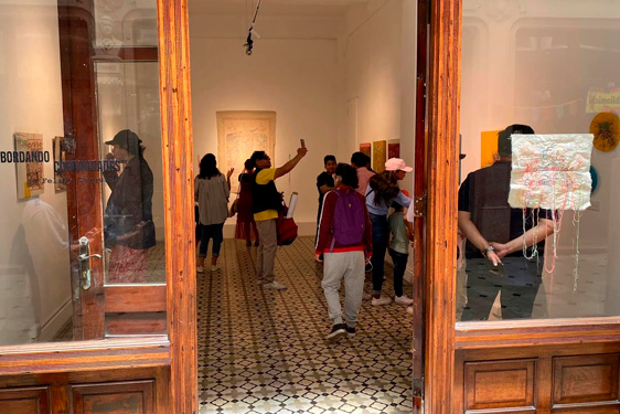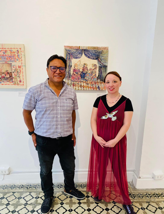 En una evocación al arte tradicional del bordado textil del Colca, la obra de Felipe Coaquira nos remonta a la pertenencia de ida y vuelta.